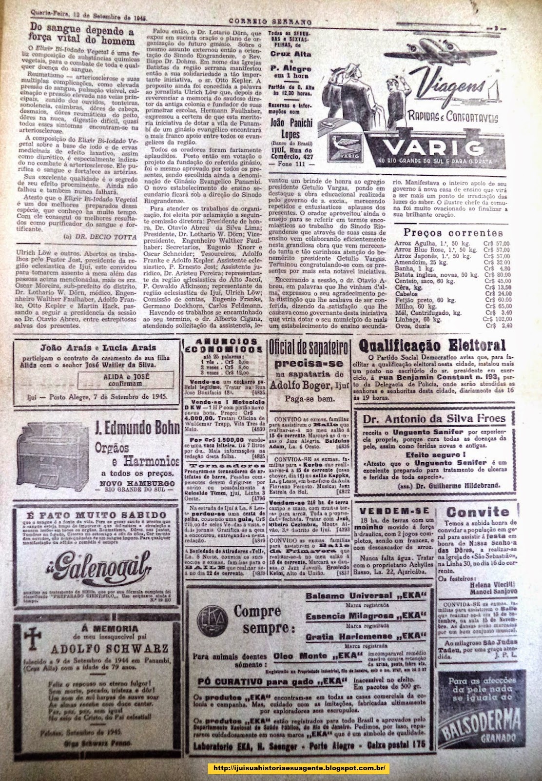 Especial e inédito: Edição integral do jornal Correio Serrano de Ijuí do dia e 12 de setembro de 1945! Convite para "Grande Comício... MONSTRO em propaganda de .... ideais políticos...na Praça Pública". Já em 1945 se anunciava o surgimento do Cine-Teatro América inaugurado somente em 1955!